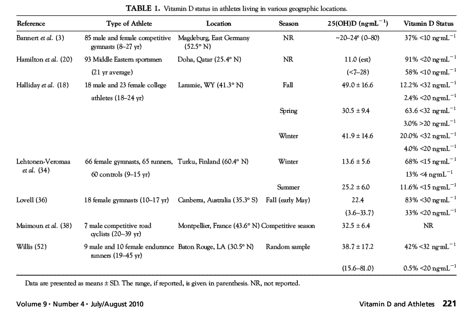 Given the recent findings, it is imperative that sports dietitians and physicians routinely assess vitamin D status and make recommendations to help athletes achieve a serum 25(OH)D concentration of ?32 and preferably ?40 ng·mL?1. Further research is needed to determine the effect of vitamin D status on injury, training, and performance in athletes.