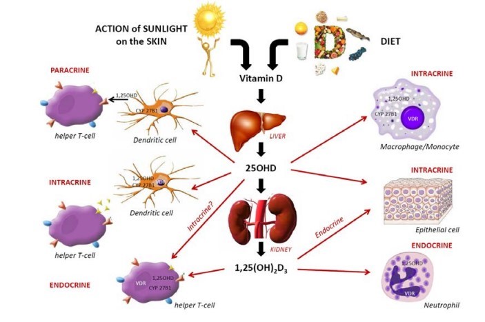 Indubitably, the current idea that 25(OH)VitD and 1,25(OH)2VitD are more than just key players in bone formation is acceptable. This review has clearly shown that the cellular component of both arms of the immune system are not only targets for the active form of VitD but are also able to activate circulating 25(OH)VitD arguing for intracrine and paracrine activities in addition to the classic endocrine pathway.