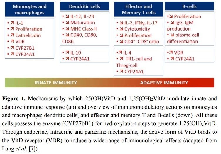 Figure 1. Mechanisms by which 25(OH)VitD and 1,25(OH)2VitD modulate innate and adaptive immune response (up) and overview of immunomodulatory actions on monocytes and macrophage; dendritic cells; and effector and memory T and B-cells (down). All these cells possess the enzyme (CYP27bB1) for hydroxylation steps to generate 1,25(OH)2VitD. Through endocrine, intracrine and paracrine mechanisms, the active form of VitD binds to the VitD receptor (VDR) to induce a wide range of immunological effects (adapted from Lang et al. [7]).
