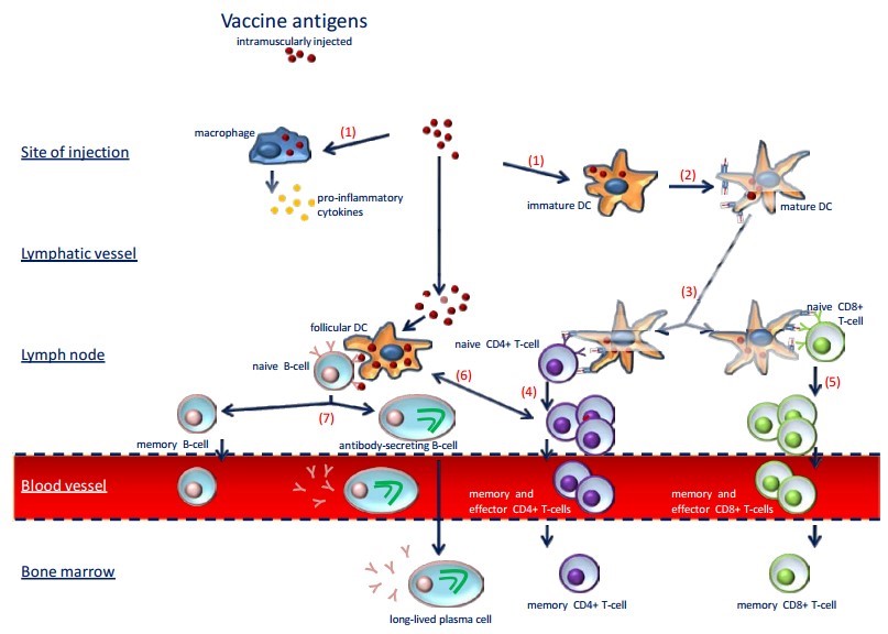 Nutrients 07 02044 g002 1024 Figure 2. Schematic representation of the vaccine immune response. Administration of vaccine antigens induces the activation of the innate immune system. Antigens are first taken up by antigen-presenting cells (1). This local innate immune response facilitates maturation of dendritic cells (DCs) (2). Mature DCs migrate into lymph nodes (3), where they induce activation and clonal expansion of naive CD4+ (4) and CD8+ (5) T-cells. The activation and differentiation of naive B-cells is induced by antigen and CD4+ T helper cells (6) as well. Naive B-cells differentiate into memory B-cells and antibody-secreting B-cells (7). (Adapted from Lang et al. [47]).4.2. Translating Immunomodulatory Roles of VitD in Vaccine Response