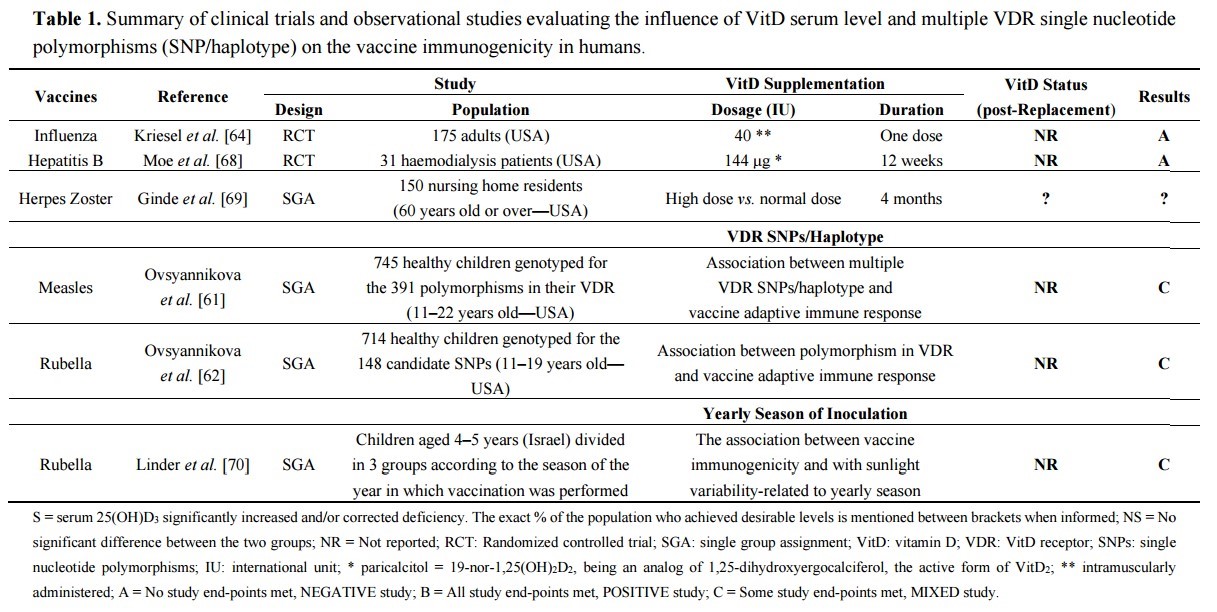 Table Table 1. Summary of clinical trials and observational studies evaluating the influence of VitD serum level and multiple VDR single nucleotide polymorphisms (SNP/haplotype) on the vaccine immunogenicity in humans.Similarly, in a randomized controlled trial (RCT) conducted in thirty-one haemodialysis patients with standard hepatitis B booster vaccine, the intravenous administration of 4 μg of paricalcitol (i.e., an analog of the active form of VitD2) with the haemodialysis session three times weekly over 12 weeks were compared to placebo. The in vivo memory response and in vitro proliferation and release of IL-2, IL-6, TNF-α, and INF-γ were not different between the groups [68]. In contrast to clinical immune effects, paricalcitol increased serum calcium levels and decreased further PTH and bone alkaline phosphatase levels significantly. However, patients were not under VitD supplementation at baseline and both exact serum 25(OH)VitD at baseline and after complementation were not reported. Finally, one RCT is ongoing to determine the increase in the 3 weeks post-vaccination specific cell-mediated immune response from herpes zoster vaccination in 150 nursing home residents (60 years old or older) after 4 months of high dose vs. standard dose VitD3 supplementation [69] (final data collection and primary outcome measure: December 2014). Interestingly, specific allelic variations and haplotypes of the VDR genes seem to also modulate the specific immune response to vaccine. Using a tag SNP (i.e., representative single nucleotide polymorphism) approach, 745 healthy children were genotyped for the 391 polymorphisms in their VDR genes [61]. Significant associations between multiple VDR SNPs/haplotypes and measles-specific IL-2, IL-6, IL-10, IFN-α, IFN-γ, IFNλ-1, and TNF-α cytokine secretions were found. This suggests that allelic variations and haplotypes in the VDR genes influence adaptive immune responses to measles vaccine. Similarly, Ovsyannikova et al. [62] genotyped 714 healthy children for 148 candidate SNP markers and presented evidence that, after two doses of rubella-vaccine, polymorphisms in VDR, but also in genes modulating innate immunity influence adaptive cytokine responses.