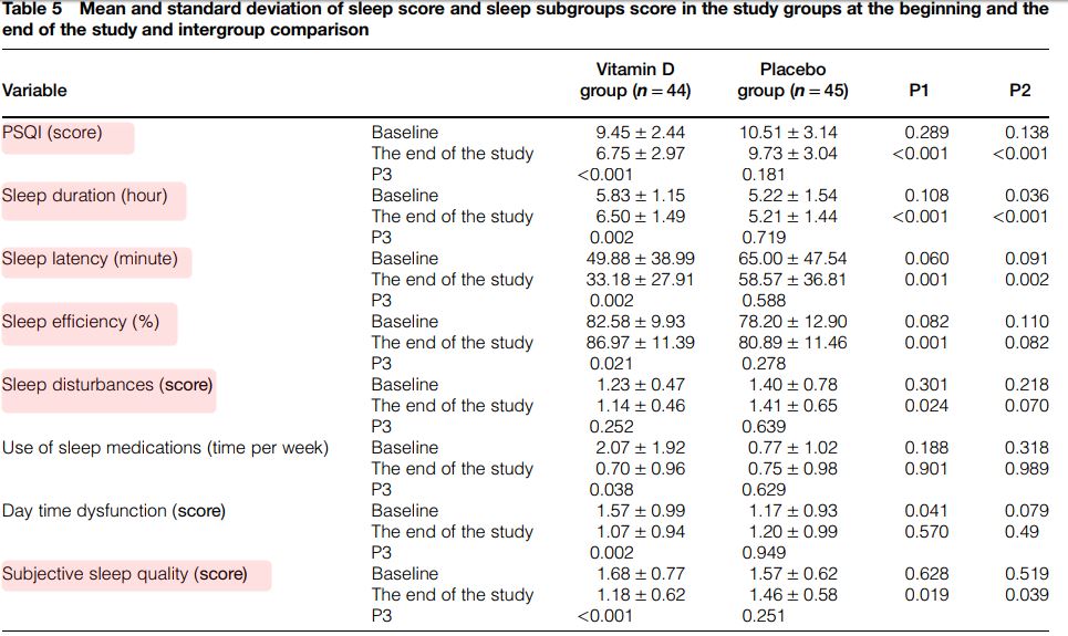 Based on the results of the present study, at the end of the study sleep score (PSQI) reduced significantly in vitamin recipients as compared with placebo recipients (P < 0.05). This difference was significant even after modifying confounding variables (P < 0.05).